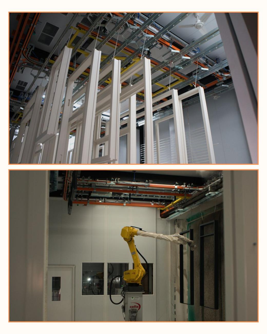 A key component of this project is the updated workflow in two spray booths, where a fully automated spraying process with robotic technology has been implemented. The traverse beam automatically enters the spray booth, where the robot sprays the first side of the window frame. As soon as the robot completes the spraying process, it immediately switches to spraying the next traverse beam. As a result, the transport time within our conveyor system is completely reduced to zero.