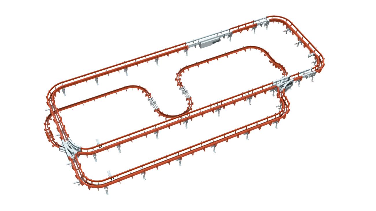 Il binario si basa sull'affidabile trasportatore Teleflex T1 Power & Free che utilizza la catena standard D8. Sono disponibili componenti standard come carrelli, curve orizzontali e verticali, unità di azionamento, interruttori, unità di rotazione, unità di lubrificazione, ecc.