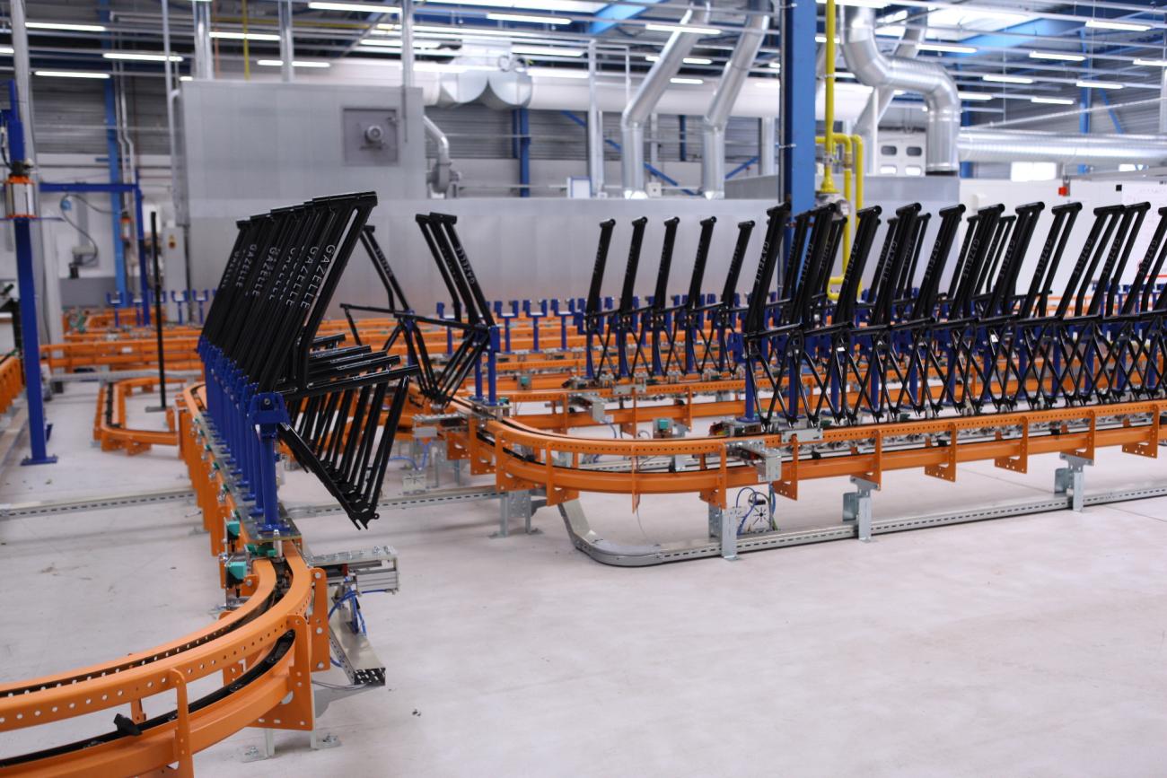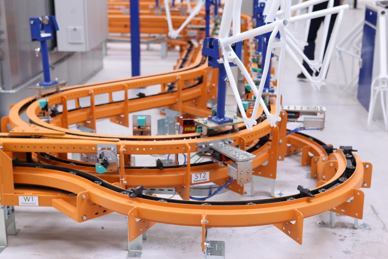 An F1 floor conveyor can be fitted with the same components as the T1 overhead system. Standard switches, horizontal and vertical bends, drive units, stop stations, and lubrication units are available to design an optimal layout.